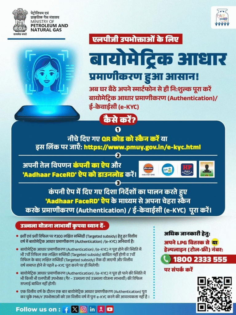 इसलिए यदि आपने अभी तक अपनी LPG Gas e-KYC नहीं की है, तो देर न करें। आज ही अपनी गैस कंपनी की आधिकारिक ऐप या वेबसाइट के माध्यम से प्रक्रिया पूरी करें, ताकि आपकी सब्सिडी, रिफिलिंग और अन्य सेवाएं निर्बाध रूप से जारी रहें। याद रखें समय पर KYC, आपकी सुविधा और सुरक्षा की गारंटी है।